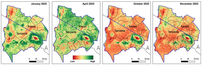 Wildlife is faring somewhat better than livestock. This is seen in the delayed drop in body condition (Figure 6) due to the far smaller wildlife numbers and greater pasture reserves in Amboseli and Chyulu National Parks. As in the 2022 drought, a large influx of cattle into the national parks could see wildlife body condition drop steeply in the coming dry season.
